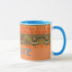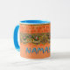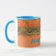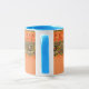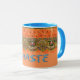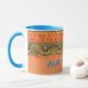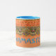 Preciosa taza de café naranja y turquesa con Namaste con un hermoso diseño indio en ella.
