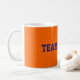 Coffee Mug con base naranja y diseño de texto de personalizado azul oscuro "Team Naranja". Ahora es fácil de personalizar con tu propio nombre de equipo, el logo de la ciudad, etc. Diseño de Alma Wad.