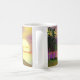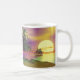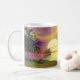 Café con mis obras de arte de una escena tropical soleada y relajante de una isla, palmeras y veleros navegando tras una gran puesta de sol.