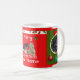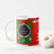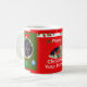 Navidad rojo y verde, juguetes, acebo, un oso de peluche y perros de aguas de juguete inglés en una taza de café que dice Felices Navidad.
