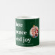 Este diseño minimalista presenta un mensaje clásico "Amor, Paz y Alegría", deseos sinceros, tipografía moderna y elegante sobre un fondo verde bosque atemporal y clásico. Combinado con un marco de foto de adorno navideño divertido, esta taza de café es perfecta para cualquiera que busque un regalo de vacaciones verdaderamente personalizado con un toque alegre. Totalmente personalizable con tu foto y nombres. Ideal para difundir la alegría navideña con estilo contemporáneo y elegancia atemporal.