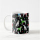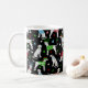 Perros de Navidades muy amables vestidos con ropa festiva. El dálmata con abrigos blancos y negros lleva sombreros de Santa, corderos, suéteres en un fondo vacacional con ornamentos dispersos.