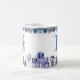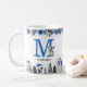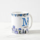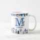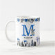 Una taza de navidades azules con elegantes flores de navidad y follaje, adorables pingüinos, muñecos de nieve, regalos, tu nombre inicial y el nombre.