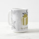 Disfrute de su café matutino esta temporada de vacaciones con un tazón de café con Navidades de oro. El diseño de Mug incluye un vibrante regalo de Navidades envueltos adornado con copos de nieve grises y blancos sobre un fondo gris. También hay artículos de regalo y de vacaciones disponibles con este diseño.