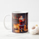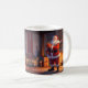 Una cálida y acogedora escena de Navidades con Santa Claus junto a una chimenea. Santa, vestido con su clásico traje rojo con guarnecido de piel blanca, sostiene un regalo bellamente envuelto con una cinta dorada. La sala está decorada para las vacaciones, con un árbol de Navidad luminoso adornado con adornos, guirnaldas y una estrella brillante en lo alto. Se organizan cuidadosamente regalos coloridos alrededor del árbol y del hogar. El mantel situado encima de la chimenea está decorado con velas y una corona de flores con un arco rojo. A través de la ventana se puede ver una velada nevada que completa el ambiente Navidad.