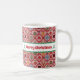 Esta taza de Navidad de suéter feo está basada en el tema de los diseños de punto de Fair Isle, que también son feos Navidades de suéter. El patrón es de círculos rojos y blancos y rayas de diamante. Cada forma tiene un motivo temático diferente para los Navidades. Hay un árbol de Navidad, reno, campana con arco, dos adornos navideños, el gorra de Santa, sombrero de muñeco de nieve y copo de nieve. Entre las formas hay pequeños árboles, copos de nieve y un presente. Personalice esta taza de café con su propio dicho o nombre o mantenga la Feliz Navidad que ya está en el diseño.