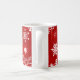 Copos de nieve blancos y rojos sobre un fondo rojo en una taza de café para personalizar con un nombre. El nombre estará un poco alejado del centro, ya que lo escondí en donde encajaba. Una buena idea para una escapada de tabletas vacacionales sería tener tazas personalizadas como asignación de asientos, y luego pueden servir como regalos para los invitados.