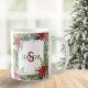 Mantente acogedor y disfruta de tus bebidas calientes con esta taza decorativa de Navidades, personalizada con un nombre y inicial como un elegante monograma. El monograma se encuentra a ambos lados de la taza., rodeado por un hermoso borde de vegetación invernal y flores rojas de poinsettia. La taza de bonito también cuenta con un muñeco de nieve con forma de acuarela, frente a la manija de la taza. Lleno de encanto festivo y botánico, la taza es un regalo ideal y un chapuzón para los amantes del té, el café o el chocolate caliente.