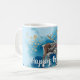 Nápoles acuarelas con lazo festivo y hondo en su personalizable blanco de brida y blanco "Felices Fiestas" texto sobre el fondo de salpicaduras de color azul y nieve