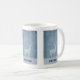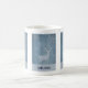 Mug personalizada con fondo de imitación de color azul. Encendido sobre la superficie, hay una silueta de reno con grandes cuernos.