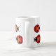 Mariquitas o mariquitas, diez pequeños escarabajos que marchan alrededor de esta taza en dos líneas. La fila del top hace frente a la derecha, y la fila inferior está haciendo frente a la izquierda. Las mariquitas son rojas y naranja con los puntos negros, cabeza negra con los puntos blancos, y sondeos o antenas negros que se encrespan. En muchas culturas, las mariquitas son símbolos afortunados de la felicidad y los deseos vienen verdad.