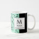 Taza de café con monograma moderno y elegante que sería un regalo ideal para Damas de Honor, Día de la Madre, Cumpleaños, Navidad y durante todo el año. El diseño muestra un patrón floral negro sobre un fondo verde menta neón con panel negro. En el centro hay un gran monograma y un nombre de marcador de posición, con texto de marcador de posición debajo que dice "PRECIOUS TO GOD" (Precioso para Dios), todos los cuales son personalizables, así que simplemente agregue su nombre y texto según sea necesario, por ejemplo, "GRACIAS". Adecuada para cualquier ocasión o propósito. Artículos coincidentes disponibles, para que pueda crear hermosos conjuntos de regalos para Bodas, Navidad, Cumpleaños, Día de la Madre, etc.