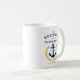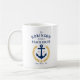 Cafetera con temática náutica personalizada con el nombre de su familia, casa de playa (o cabaña de la casa del lago, etc.), fecha y ubicación establecidas u otro texto según se desee. Entre sus instalaciones se incluye un ancla de barco de diseño personalizado con hojas de laurel de estilo dorado y estrella. Los colores son oro y azul marino clásico. Un regalo único y atemporal y una pieza de conversación.