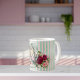Versión coloreada de la aventura de Alicia vintage en el país de las maravillas, The Mad Hatter con flores y flores añadidas, sobre un fondo de rayas rosas y acuáticas de aspecto antiguo
