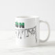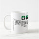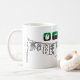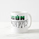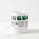 Mug de Oggun con achaba. Nombre de Oggun en texto con diseño cobrie. Impreso en tres colores; verde, negro y gris.