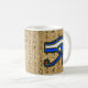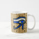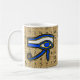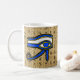 Mug con el símbolo egipcio antiguo, el ojo horus en los jeroglíficos. Este diseño presenta el Ojo de Horus en contornos azules, amarillos y negros sobre un fondo jeroglífico.