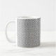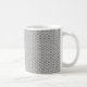 Esta taza tiene un diseño Art Déco de líneas curvas negras en forma de triángulo sobre un campo de blanco repetido a lo largo del diseño.