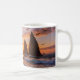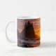 Rocky spires rise above the sea, as the sun sets over the horizon. Colorful, beautiful, and peaceful scene.