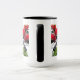 Una taza de café con un mapa de la Isla Sur de Nueva Zelanda, flores de Pohutukawa (árbol nativo), un helecho y un kokako (pájaro nativo)
