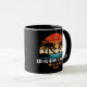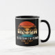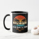 Una taza de café con una puesta de sol sobre palmeras, la playa con sombrillas y sillas de playa, con la frase "Rompe con la Rutina" centrada debajo de la imagen. El diseño sugiere una escapada pacífica y relajante de los estrés diario, evocando imágenes de un paraíso tropical.