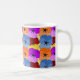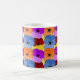Esta taza tiene un diseño primaveral de morado, azul, naranja y rojo con panes amarillos en un campo de amarillo.