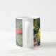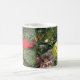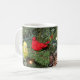 El parakeet o el budgie amarillo y verde se sienta comfortablemente en un árbol de navidad al lado de una taza o de una taza del día de fiesta del navidad de los amantes del pájaro del ornamento del cardenal