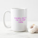 A minimalist design featuring bold magenta serif text centered on a soft grey background, celebrating the essential link between parenting and caffeine