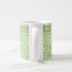 Una taza de café de moda para personalizar, con un patrón de contornos de hojas blancas en un fondo verde de Apple. Como parte de la colección "Apple Blossom" de Posh & Painterly, puedes eliminar el texto y la banda si prefieres tu taza sin personalización. También puede cambiar fácilmente el tamaño del patrón de hojas blancas y verdes, si lo desea, y con un pequeño ajuste, este diseño se adaptará a cualquiera de las opciones de Mugs.
