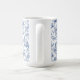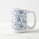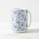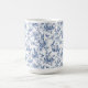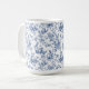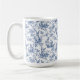 El encantador tazón de café con temática primaveral presenta un estilo de tela de Jouy azul y blanco con conejillos, mariposas y flores de primavera.