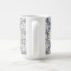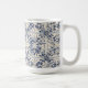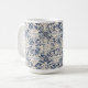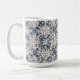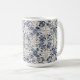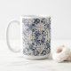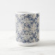 Patrón floral de alfombra persa de marina y crema en una taza blanca.