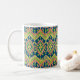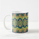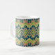 Una taza de café de moda, con un patrón étnico de Ikat en terracota, amarillo dorado y verde sobre un fondo azul profundo. Como parte de la colección "Ikat" de Posh & Painterly, puede personalizar fácilmente este Café Mug cambiando el tamaño o rotando la ficha de patrón de Ikat. Este patrón se ajustará a cualquier taza de café.
