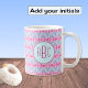 El diseño de esta taza ha sido creado por un patrón repetido de ruedas de bicicleta con colores rosa profundo y acuático. Personalice esto introduciendo las tres iniciales seleccionadas en los cuadros que se muestran para realizar un monograma. Un regalo único para cualquier ciclista entusiasta.