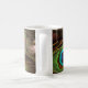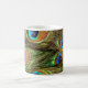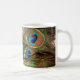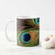 Un pavo real trae una taza clásica con una fotografía de algunas preciosas plumas de pavo real.
