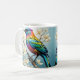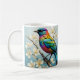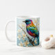 Un pájaro vibrante y multicolor se alza con gracia sobre una rama delgada, rodeado de delicadas flores blancas. El diseño es muy complejo, con un desplome radiante del pájaro, mientras que las suaves flores le dan un toque de elegancia que evoca una sensación de tranquilidad.