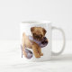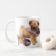 Perro de perrito lindo del barro amasado que sostiene un estilete azul en su boca, pintada por el artista Maryline Cazenave.