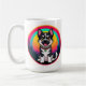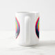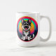 Ilustracion de un animado perro de dibujos animados sentado frente a un colorido fondo de arcoiris, con un ambiente lúdico y rodeado de un paisaje forestal sereno, que resalta la alegría y la vibrante arte.