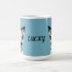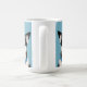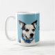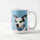 Ilustracion de un perro blanco y negro con un collar azul claro, mostrando una expresión tranquila y atenta, destacando la delicada conducta del perro y su aspecto encantador.