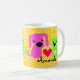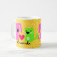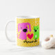 Personalice la taza de este amante lindo del mascota con su nombre. Pique el perro y el gato con el backgrouind punteado polca rojo del corazón y del naranja.