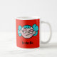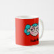 Esta taza de café ha personalizado tu nombre con una cara graciosa de Personalizado sobre fondo rojo.