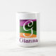 Monograma moderno Letra inicial café verde Mug. Carta G. Empieza tu día con un toque personalizado! Esta elegante taza de café presenta una letra inicial sobre un fondo geométrico minimalista morado, verde y amarillo. Perfecto como regalo para amigos o familiares, combina estilo y funcionalidad con un diseño de monograma de moda.