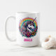 Unicornio arcoiris colorido y flores con una taza de café personalizada con fondo de arcoiris.