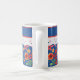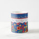 Un tazón de café de bonito blanco para personalizar, con un toque nostálgico y un patrón retro floral en un fondo azul profundo, recortado con efecto de encaje blanco. Parte de la colección "Granny Print" de Posh & Painterly, este patrón de collage de papel pintado a mano puede ajustarse fácilmente para que se ajuste a cualquier Mug.