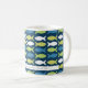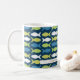Este adorable tazón de café con patrón de pescado personalizado sería perfecto como regalo para un pescador. En este diseño, los peces son azules, verdes, amarillos y blancos sobre un fondo azul oscuro.