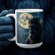Trampa de café de pie grande. Un Sasquatch con ojos dorados brillantes con un búho en el hombro con fondo de bosque Luna Llena en tonos azules.