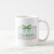 This cute ceramic mug features a pink frame with blue and white stripes and topped with a preppy green and white gingham plaid bow on each side on a background of light blue polka dots. Personalize with your choice of name or special text on the front and back. Fun for personalized party favors and gift bags.