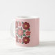 This mug features a symmetrical floral pattern design on a light pink background. The pattern features large burgundy flowers with radiating red stripes and yellow centers, arranged in a square formation. Each large flower is accompanied by smaller pink flowers with yellow centers and green leaves. The leaves are arranged around the flowers in a balanced pattern. The design has a retro, mid-century modern aesthetic with neat lines and solid colors. The mug is a classic white mug. The mug is an eleven ounce mug. The mug is microwave and dishwasher safe.