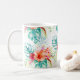 PixDezines Tropical Paradise mug with DIY background color. Featuring lush turquoise hues of tropical foliage and red orange flowers, bird of paradise, dark red plumeria, hibiscus and palm leaves. The design is an adjustable tiled image, copy+paste on reversed side if so desired.