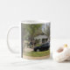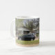 Una taza de café con una foto de vehículos policiales.