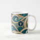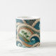 This beachy mug will remind you of the beach, surf, and sand, whether you're lounging on the porch of a coastal cabin among or curled by the fire in snow country. Swirls of Polynesian waves reveal tropical blue and geen jewel tones of the South Pacific and palm trees in a vintage style, remniscent of beach-inspired ethnic art or tattoos. Your s;ingle initial appears on the front and back on a teal green circle, bordered in sandy tan.