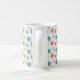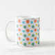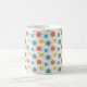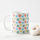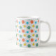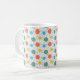 Esta taza tiene un diseño moderno de mediados de siglo de círculos con líneas en naranja, amarillo, turquesa y verde.
